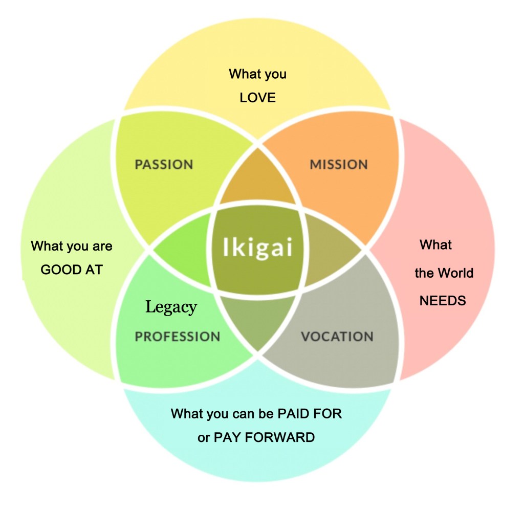 By reflecting on each of these elements and exploring where they overlap, you’re well on your way to uncovering, rediscovering or updating your Ikigai and living a life with a sense of purpose that is consistent with who you really are at your core.