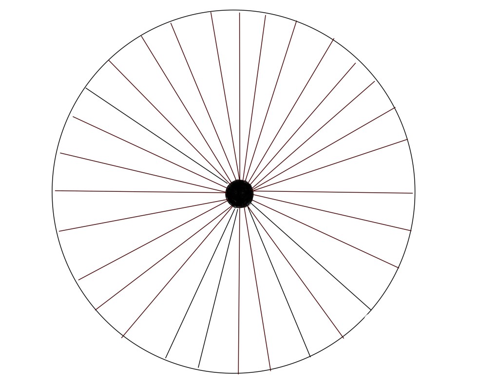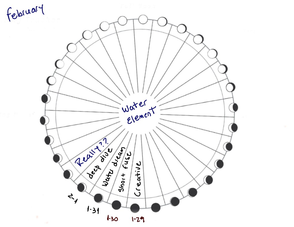 ~ If you have a menstrual cycle, divide the circumference into the number of days in your cycle, then join the divisions with lines to the center. Mark on the outside of the circle the calendar dates and on the inside of the circle the number of your cycle. Also mark in the different phases of the moon.